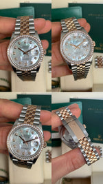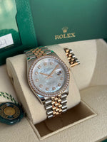 Pre-owned Rolex Datejust 36mm Mother of Pearl Diamond Dial Factory RBR Bezel 128281RBR 2021 Complete Set