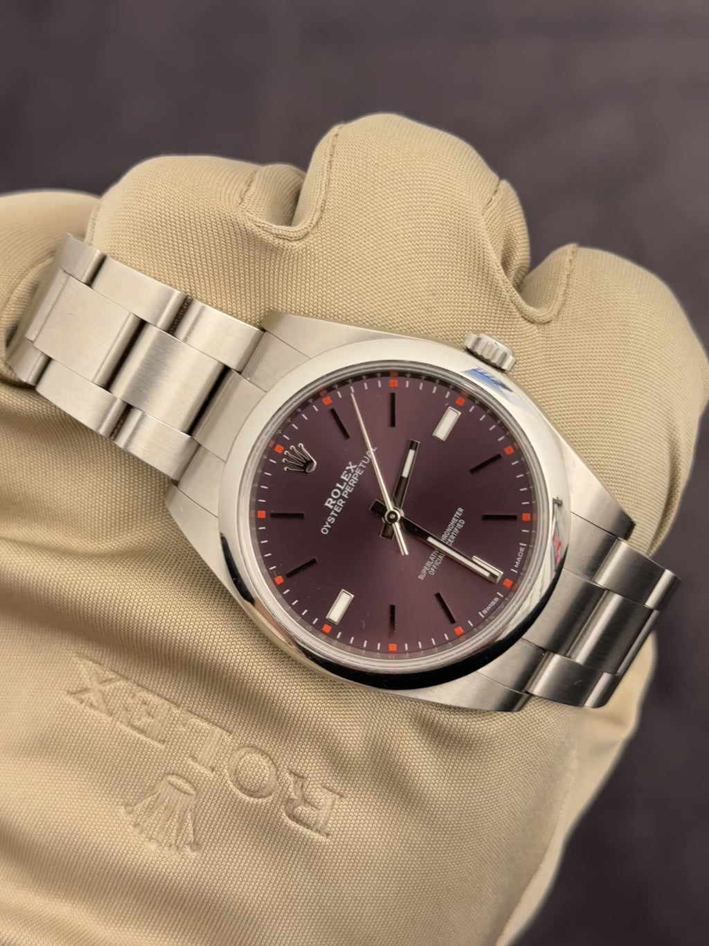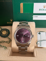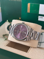 Pre-owned Rolex Oyster Perpetual 39mm Grape Dial 114300 2019 Box and Papers